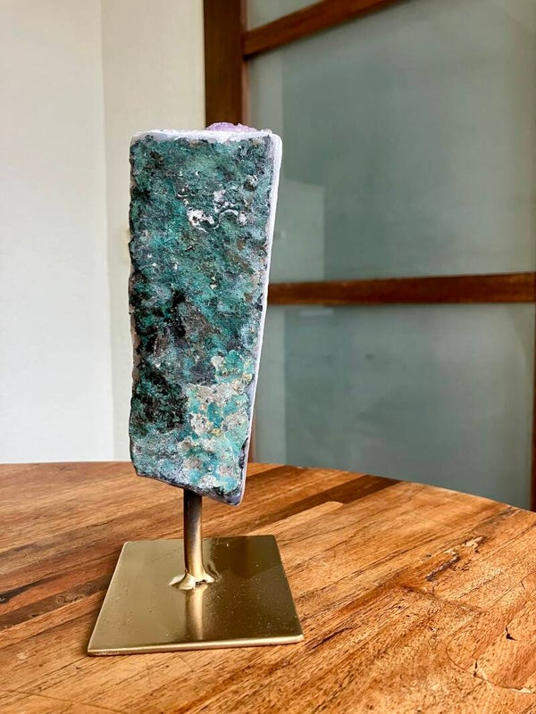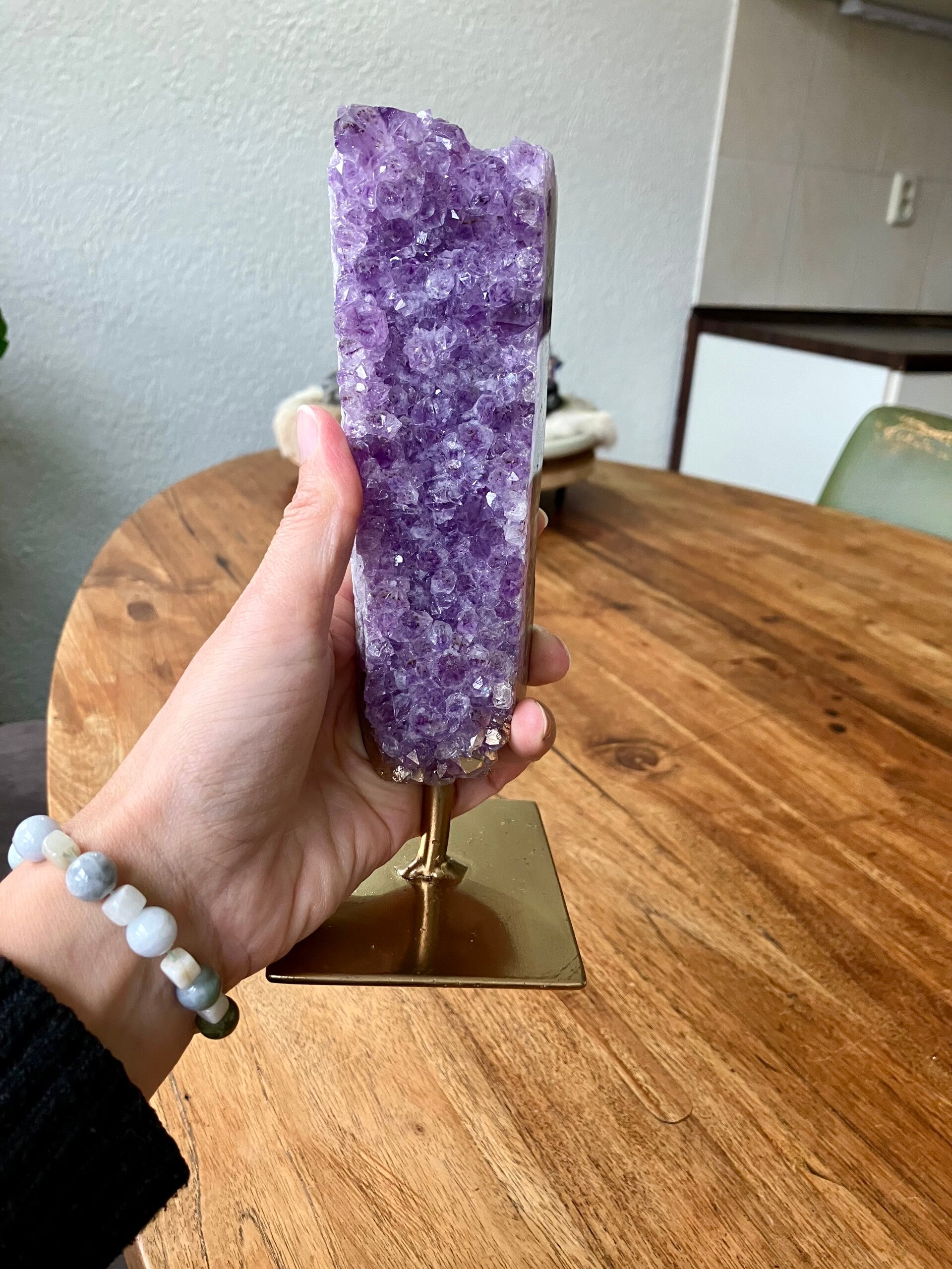 Amethist op standaard van 928 gram. Hoogte 20 cm. Breedte 5 cm. Je ontvangt het stuk van de foto. Mindful wonen met amethist voor balans, harmonie en zuivering in huis.