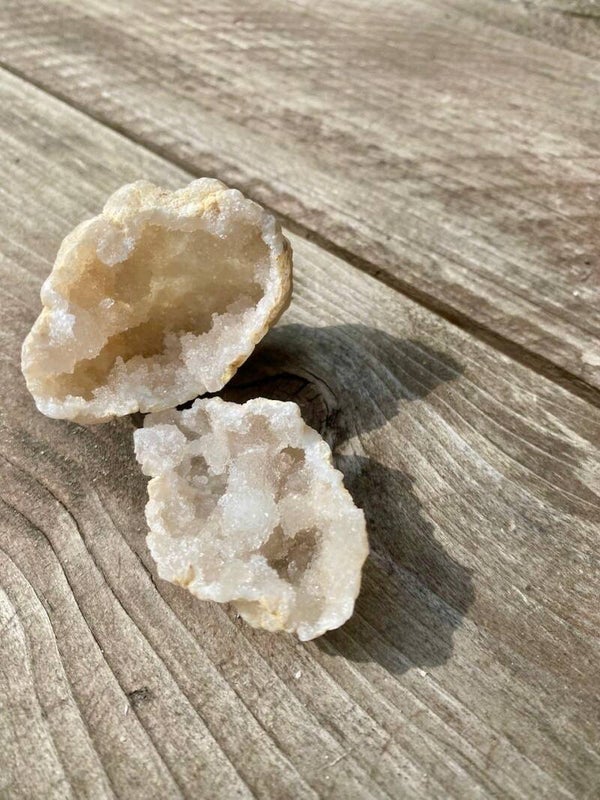 Je ontvangt 1 van de geodes van de 1e foto. De 2e foto is een voorbeeld foto van hoe het er van binnen uit kan zien. Dit is een indicatie. Elke geode is weer uniek.