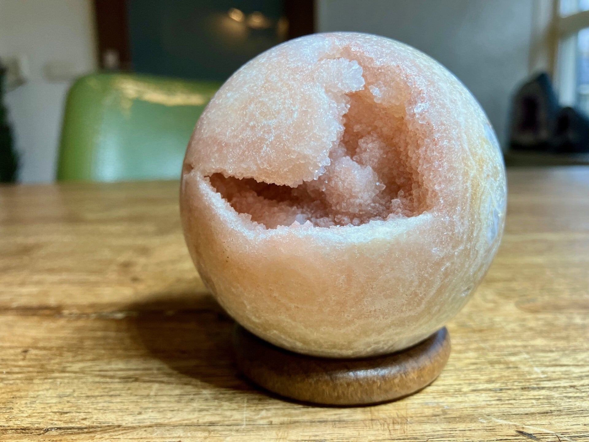 Roze amethist bol van 546 gram. Je ontvangt de bol van de foto exclusief ring om de bol op te zetten.