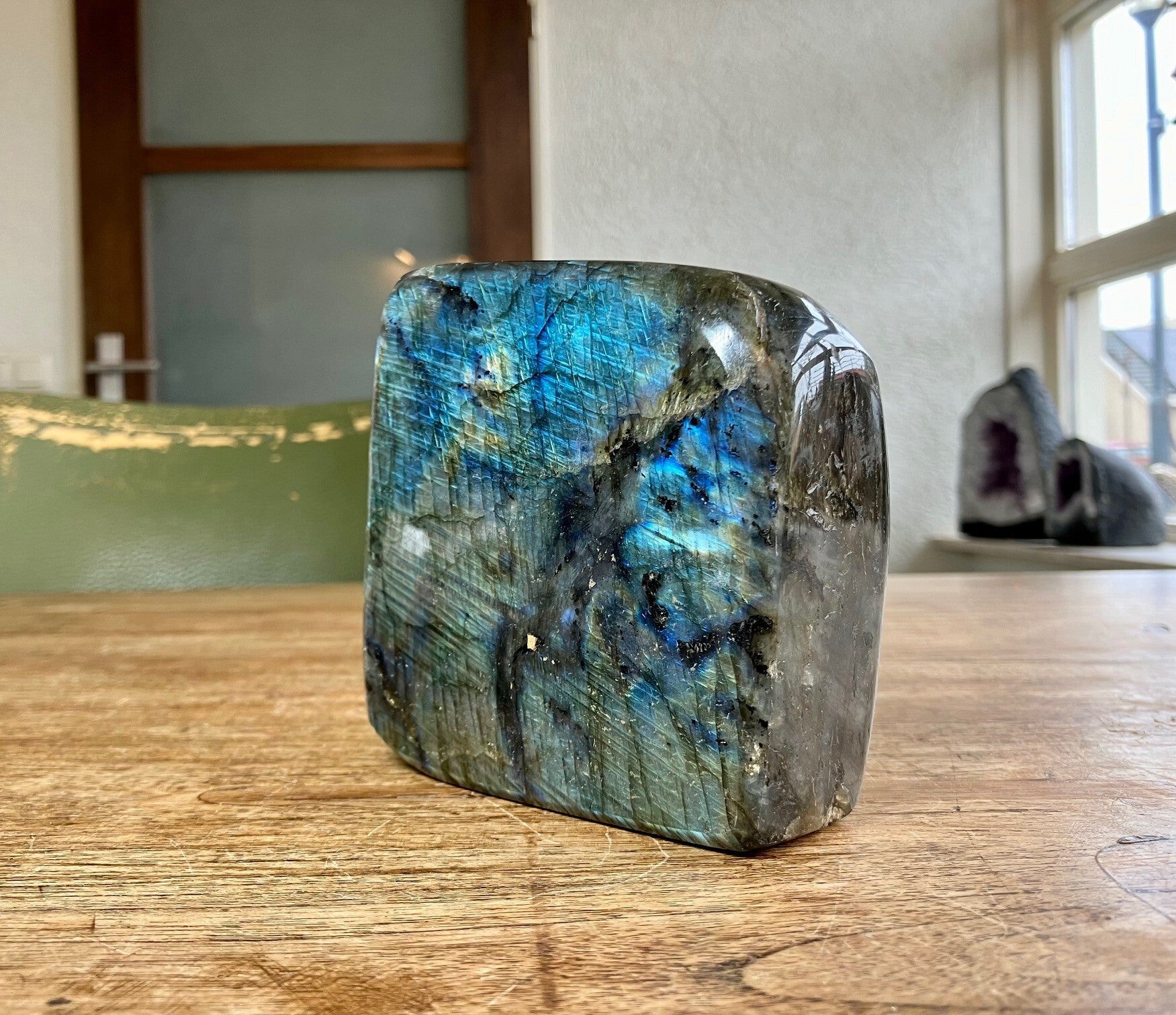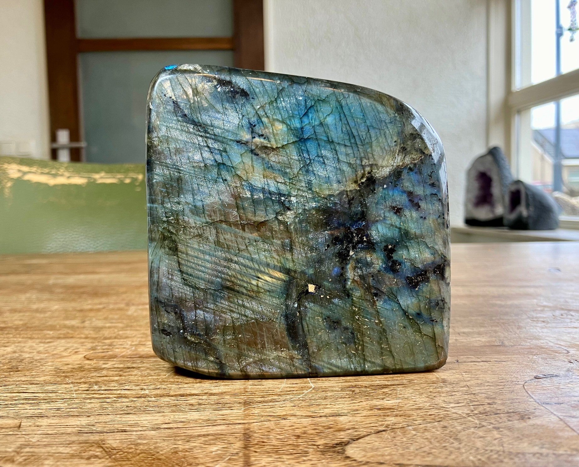 Labradoriet geeft je meer zelfvertrouwen en doorzettingsvermogen. Hij helpt je te om vergeten herinneringen naar boven te halen en de waarheid onder ogen te zien. Labradoriet werkt kalmerend en reguleert de stofwisseling. Labradoriet vermindert de gevoeligheid voor kou. Werkt heilzaam bij verkoudheid, te hoge bloeddruk, reuma, jicht en menstruatieklachten. Labradoriet beschermd je tegen negatieve invloeden van buiten en mensen of plaatsen die te veel energie afnemen.