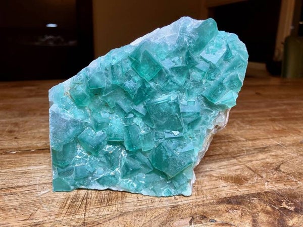 Fluoriet cluster van 838 gram. Afmeting is 15x11x3 cm.