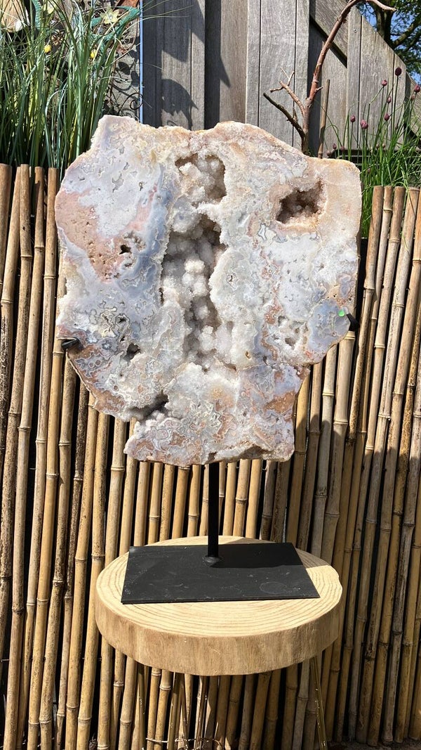 Je ontvangt de roze amethist van de foto. Gewicht 14,1 kilo. Hoogte 62,5 cm. Breedte 40 cm. Vanwege het formaat is afhalen te adviseren.