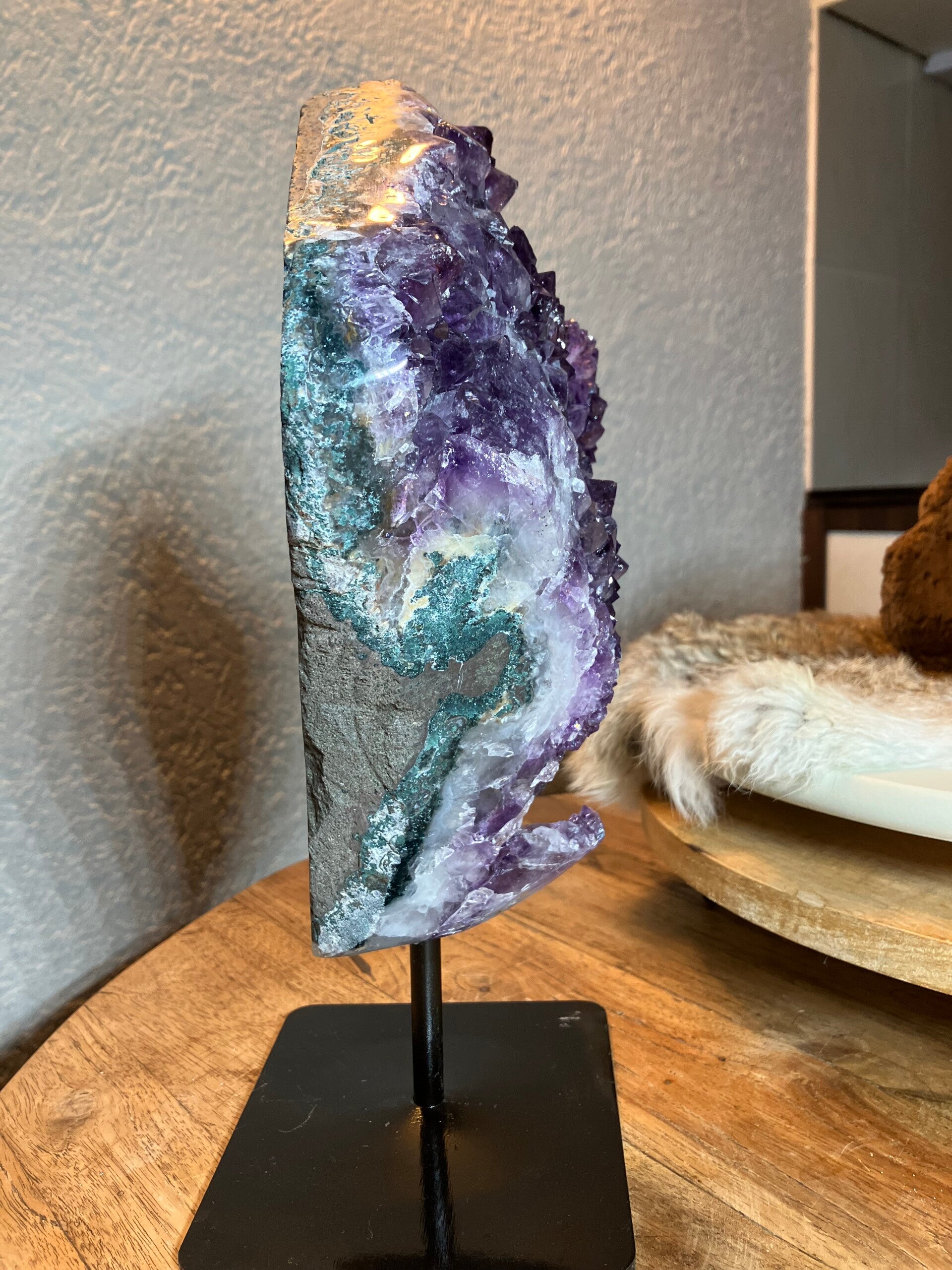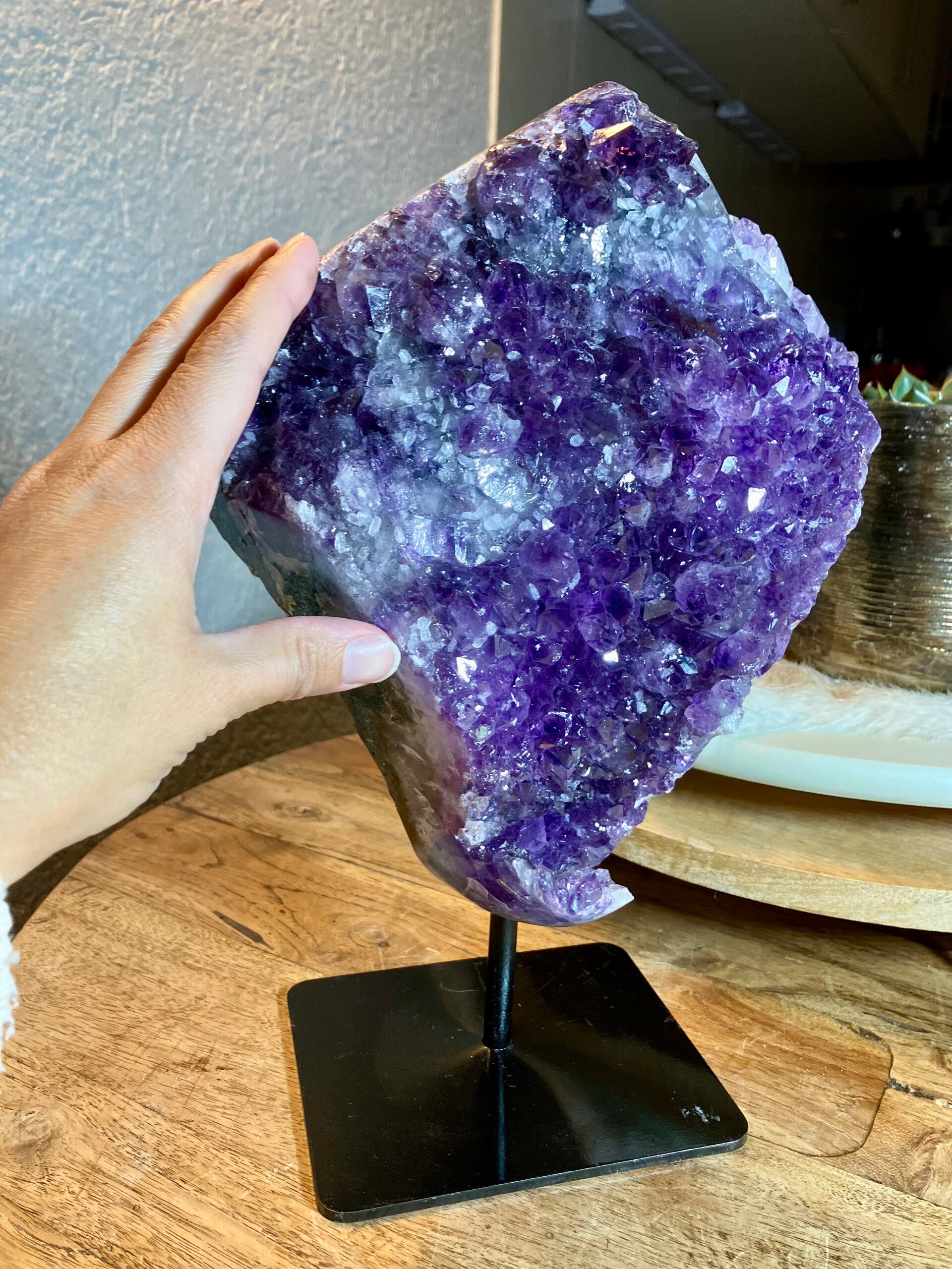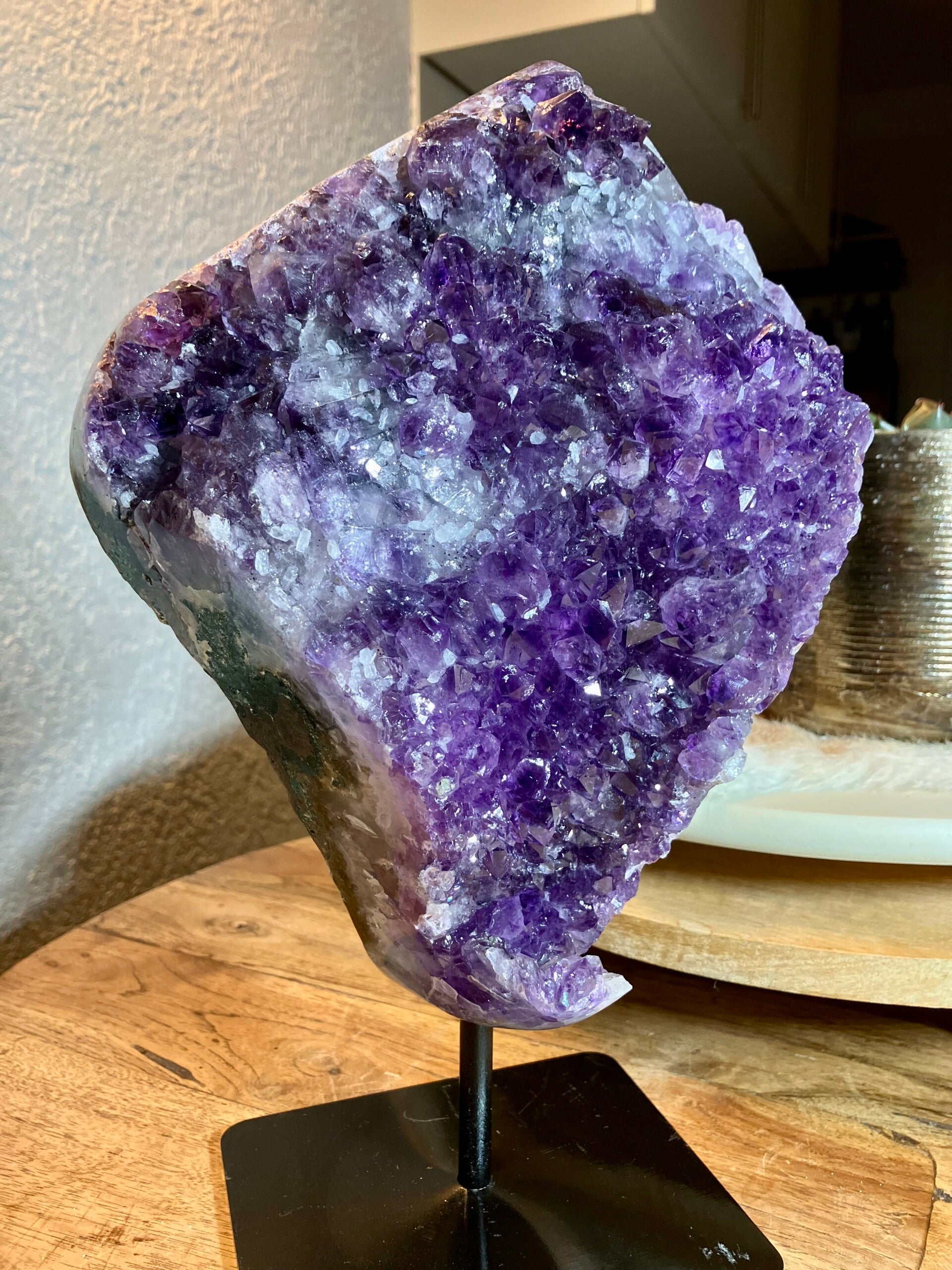 Mooie paarse kleur met fijne kristallen. Totale gewicht 5,65 kilo. Hoogte 32 cm. Breedte 21 cm. Dikte 8 cm. Je ontvangt het stuk van de foto.