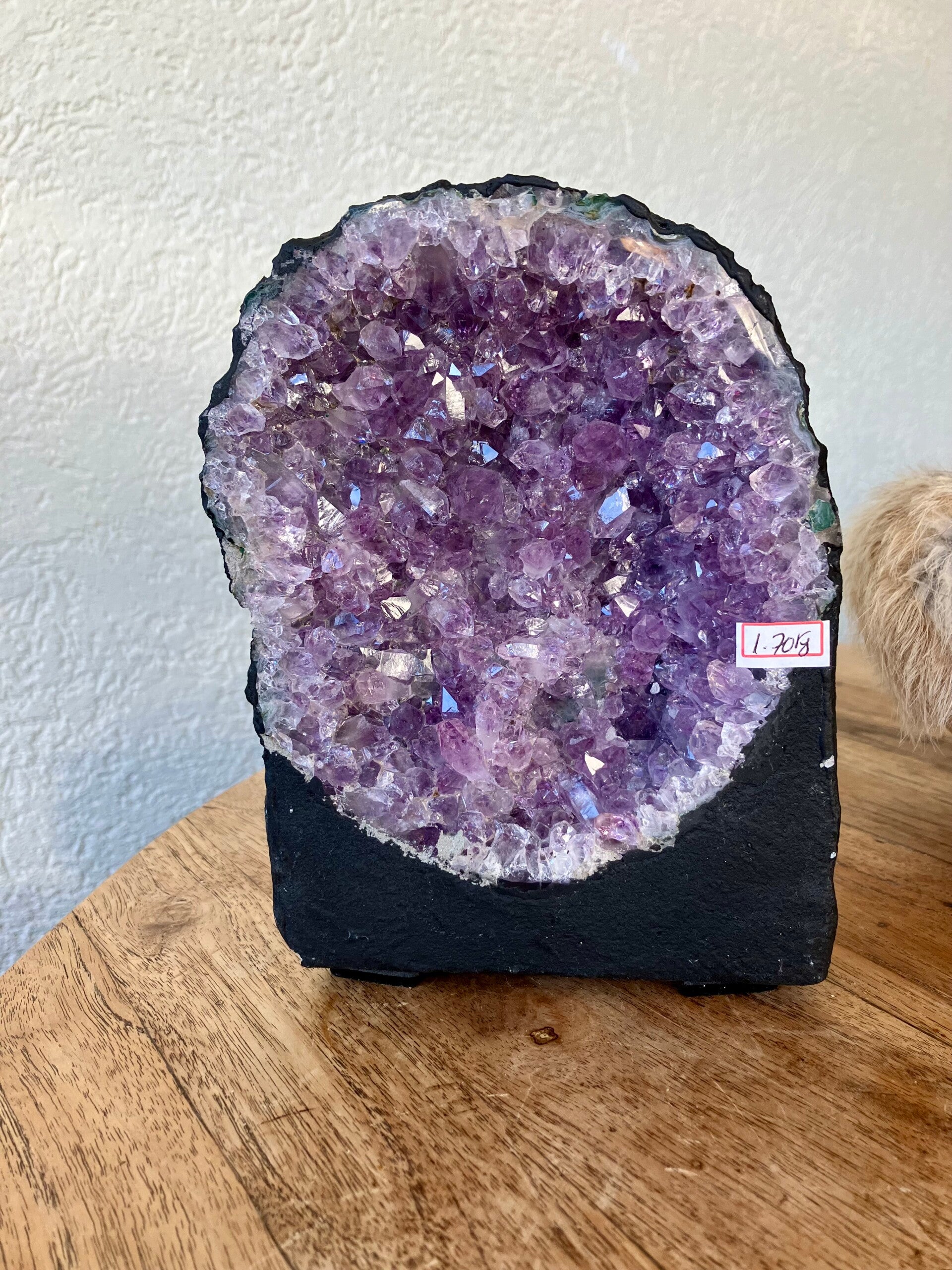 Gewicht 1,7 kilo. Hoogte 18,5 cm. Breedte 13,5 cm. Dikte 7 cm. Je ontvangt de Geode van de foto. Leuk plat model.